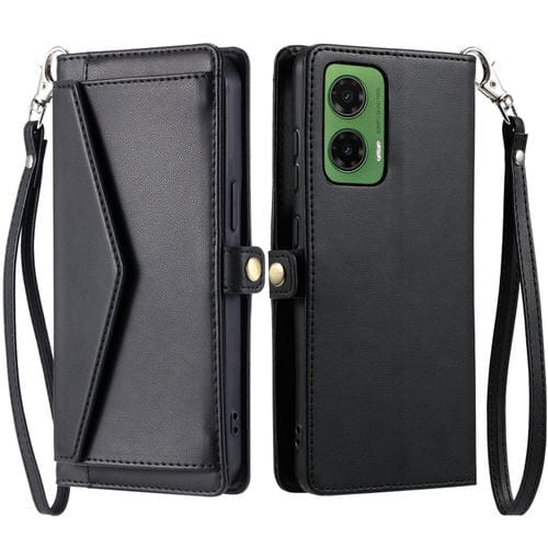 Funda de Cuero para Motorola Moto G35 con Ranura para Tarjetas y Cordón (Negro)