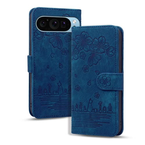 Funda de Cuero con Relieve Gato Sakura para Google Pixel 9 Pro Xl (Azul)
