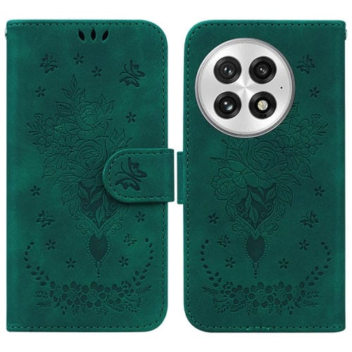 Funda de Cuero con Relieve Mariposa y Rosa para OnePlus 13 (Verde)