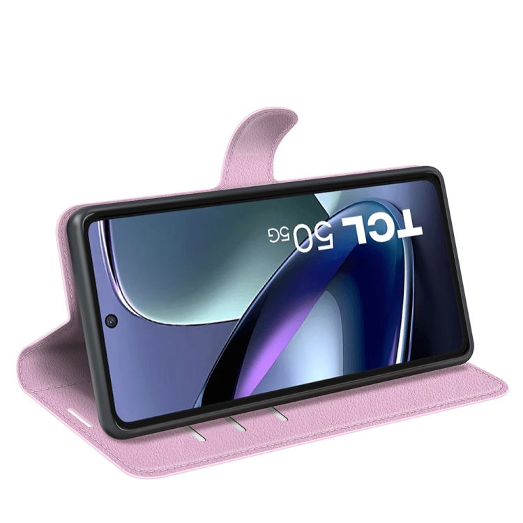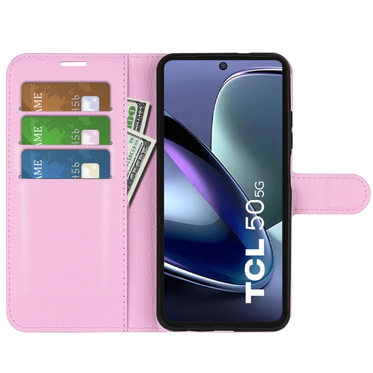 Funda de Cuero para TCL 50 5G con Tapa Horizontal y Textura de Lichi (Rosa)