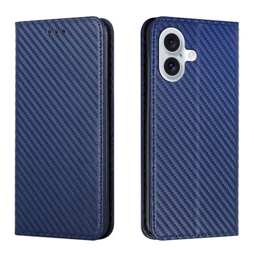 Funda de Cuero con Tapa Magnética y Textura de Fibra de Carbono para iPhone 16 Plus (Azul)