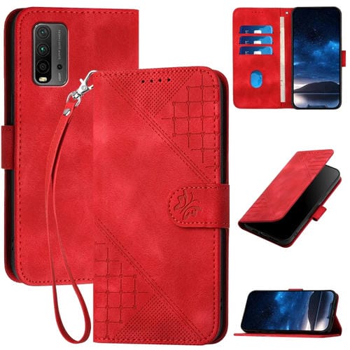 Funda de Cuero con Tapa y Cordón para Redmi 9T Yx0080 con Diseño En Relieve de Mariposa y Cuadrícula (Rojo)