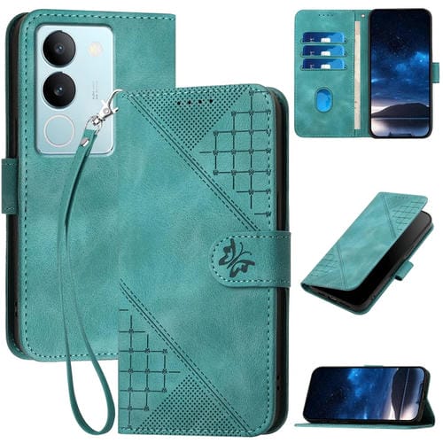 Funda de Cuero con Tapa y Cordón para Vivo V29 Pro Yx0080 con Diseño En Relieve de Mariposa y Cuadrícula (Azul Claro)