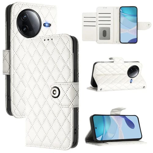 Funda de Cuero con Tapa y Textura Rómbica para Redmi K80 5G/K80 Pro 5G con Cordón (Blanco)