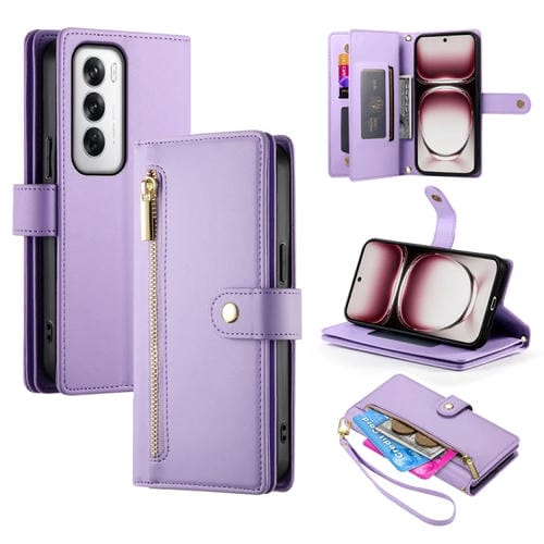 Funda de Cuero para Teléfono con Nueve Ranuras para Tarjetas y Cremallera para Oppo Reno12 Global (Morado)