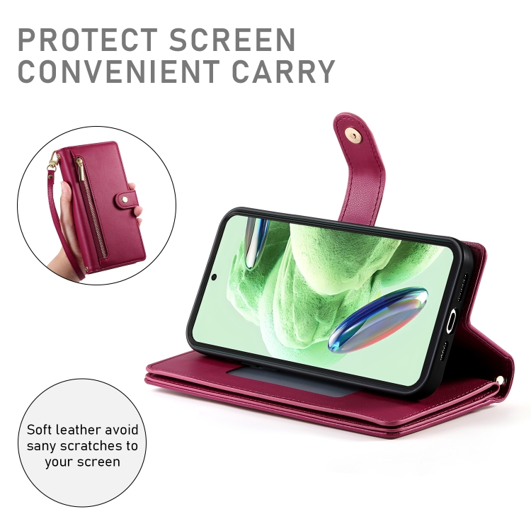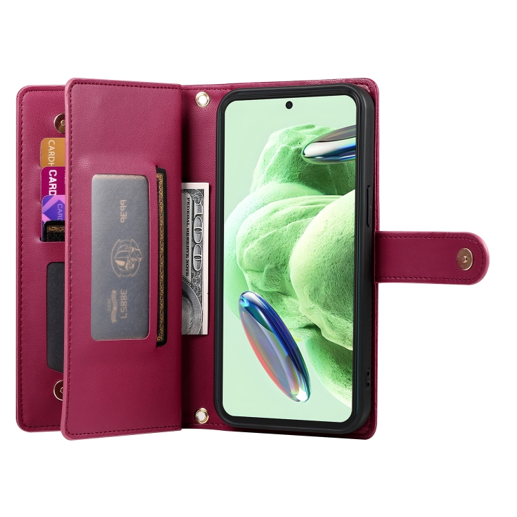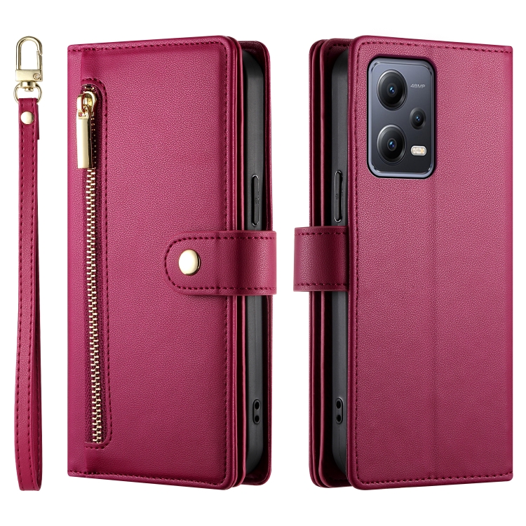 Funda de Cuero para Teléfono con Nueve Ranuras para Tarjetas y Cremallera para Redmi Note 12 5G/Xiaomi Poco X5 (Rojo)