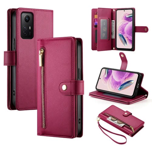 Funda de Cuero para Teléfono Redmi Note 11S 4G con Nueve Ranuras para Tarjetas y Cremallera (Rojo)