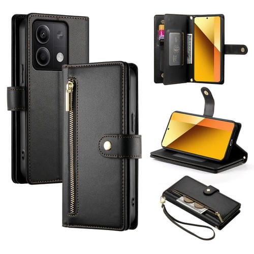 Funda de Cuero para Teléfono Redmi Note 13 5G con Nueve Ranuras para Tarjetas y Cremallera (Negro)