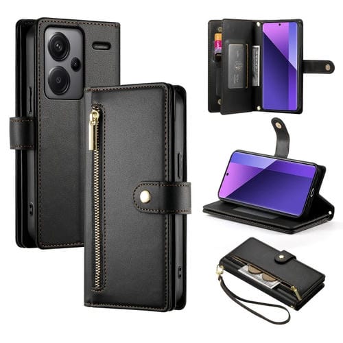 Funda de Cuero para Teléfono Redmi Note 13 Pro+ con Nueve Ranuras para Tarjetas y Cremallera (Negra)