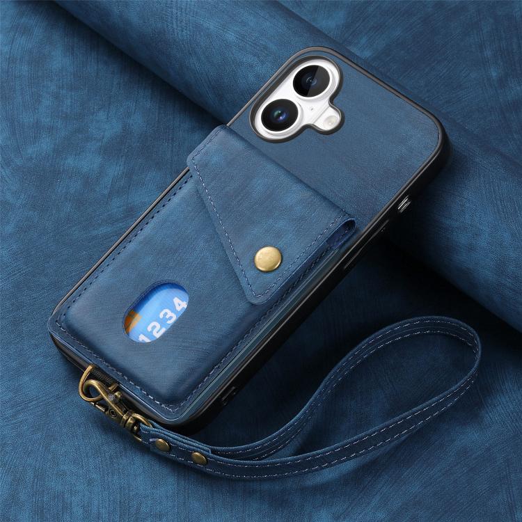 Funda de cuero plegable estilo billetera retro para iPhone 17 con correa (azul)