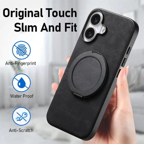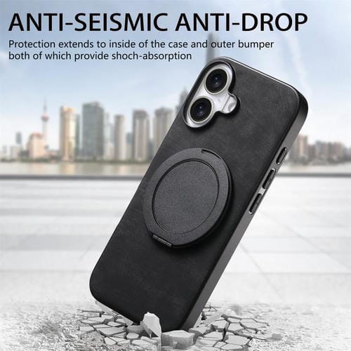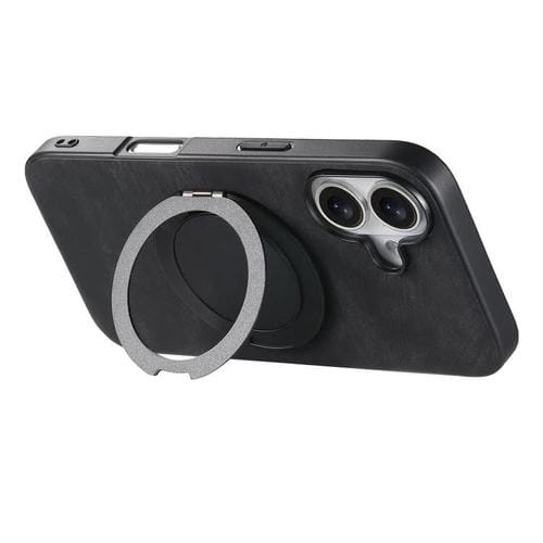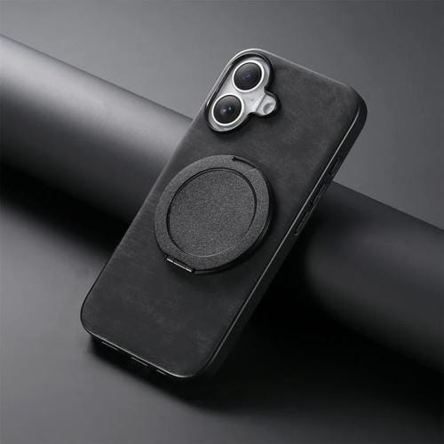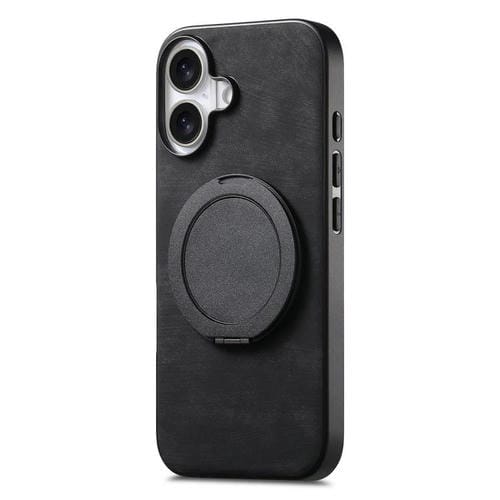 Funda de cuero retro con soporte giratorio redondo para iPhone 17 (negra)