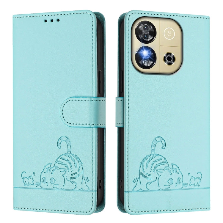 Funda de Cuero Rfid para Oukitel C57S con Estampado de Rata y Gato en Relieve y Cordón (Verde Menta)