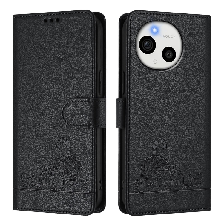 Funda de Cuero Rfid para Sharp Aquos Sense9 Plus con Estampado de Rata y Gato en Relieve y Cordón (Negro)