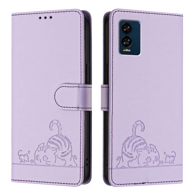 Funda Cuero Rfid Relieve Rata y Gato para Blu View Speed 5G con Cordón (Morado)