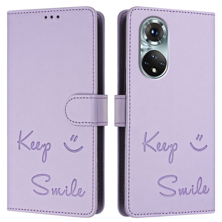 Funda de Cuero Rfid con Relieve Sonriente para Huawei Nova 9 (Morado Claro)