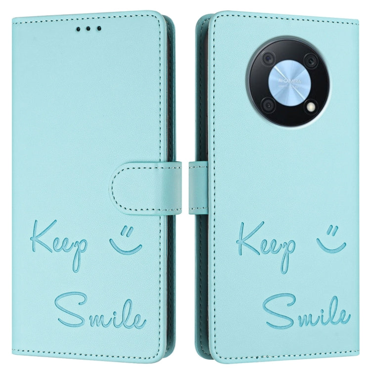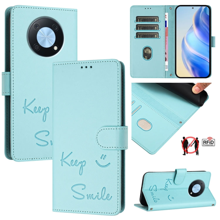 Funda de Cuero Rfid con Relieve Sonriente para Huawei Nova Y90 (Verde Menta)