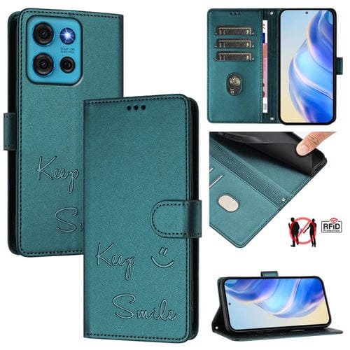 Funda de Cuero Rfid con Relieve Sonriente para Motorola Moto G75 5G (Verde Pavo Real)