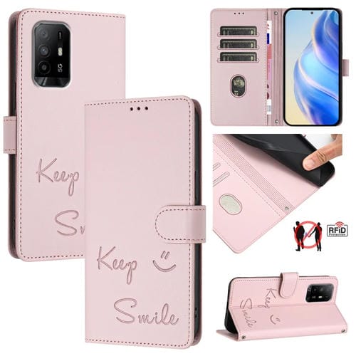 Funda de Cuero Rfid con Relieve Sonriente para Oppo A95 4G Global / Reno6 Lite (Rosa)