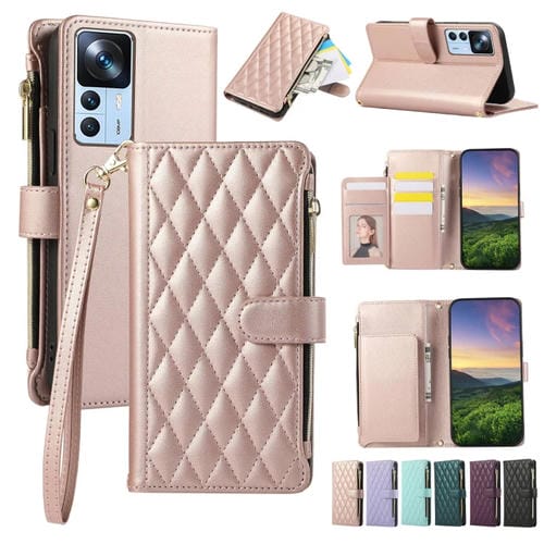 Funda de Cuero Tipo Billetera con Cremallera Rombal para Xiaomi 12T/12T Pro (Oro Rosa)