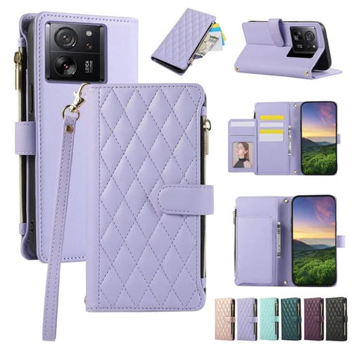 Funda de Cuero Tipo Billetera con Cremallera Rombal para Xiaomi 13T/13T Pro (Morado)