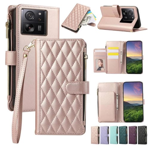 Funda de Cuero Tipo Billetera con Cremallera Rombal para Xiaomi 13T/13T Pro (Oro Rosa)