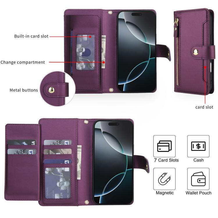 Funda de cuero tipo billetera con cremallera y siete ranuras para tarjetas para iPhone 17 Pro (morado oscuro)