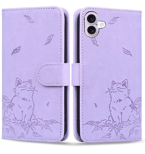 Funda de Piel con Estampado de Gato para iPhone 16 Plus (Morado)