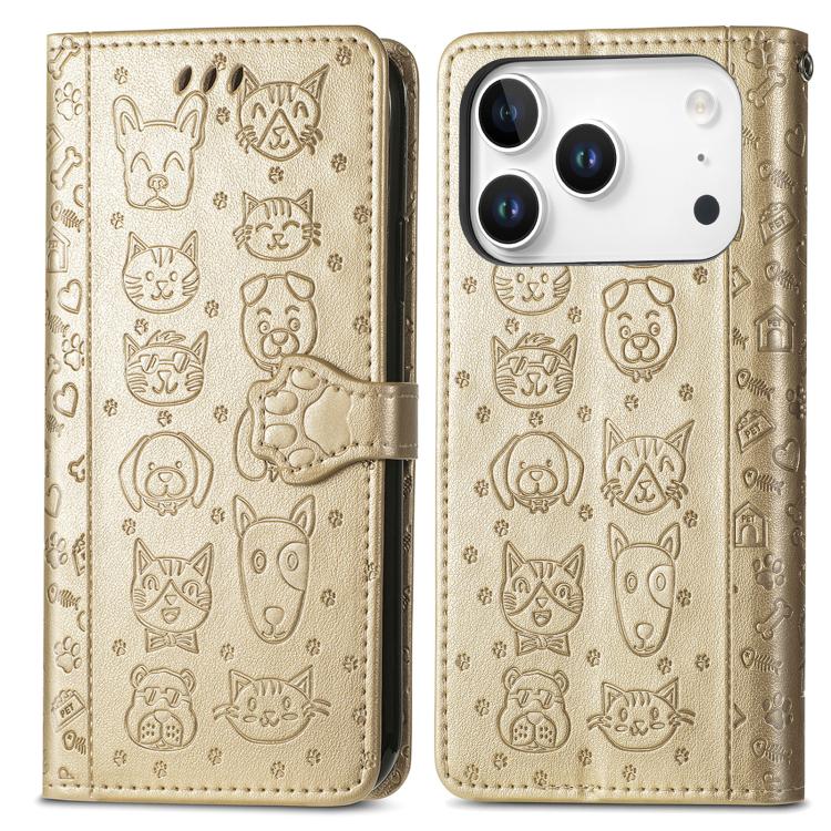 Funda de piel con estampado de gato y perro para iPhone 17 Pro (dorada)