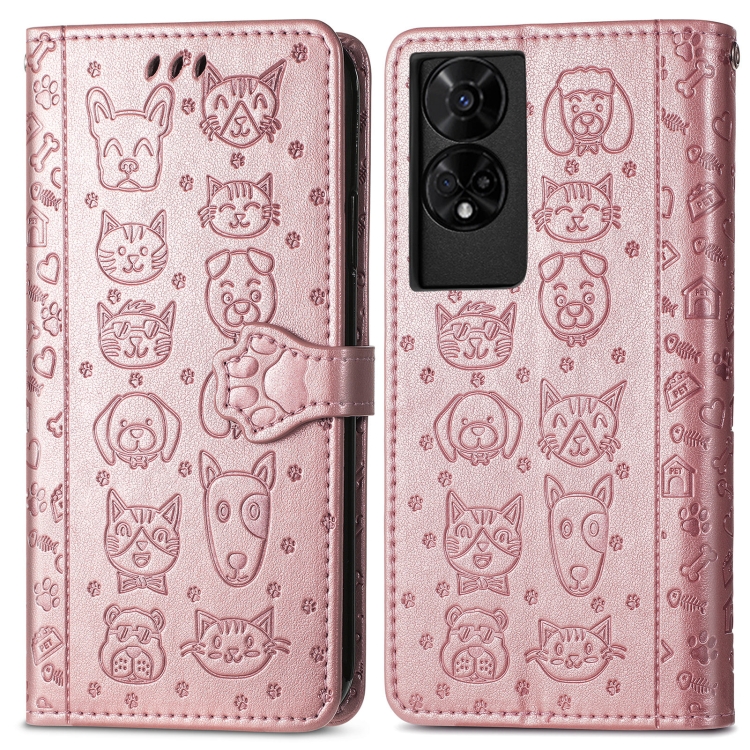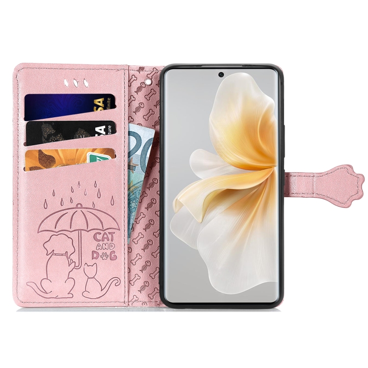 Funda de Piel con Relieve Gato y Perro para TCL 50 5G (Oro Rosa)