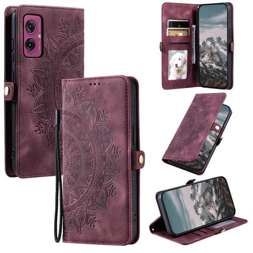 Funda de Piel con Relieve Totem para Motorola Moto G55 (Rojo Vino)