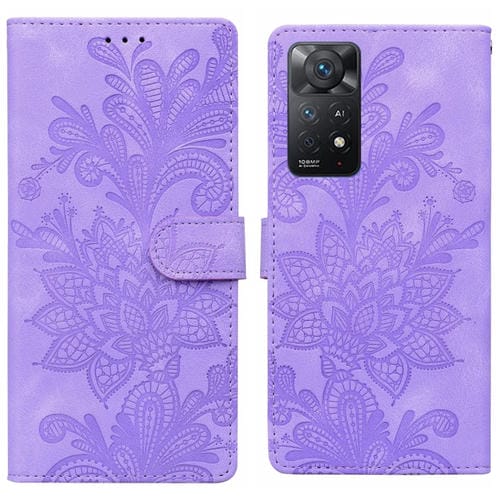 Funda de Teléfono con Hebilla Magnética de Pu con Encaje Floral En Relieve y Correa para la Muñeca para Redmi Note 11 Pro 5G (Morado)