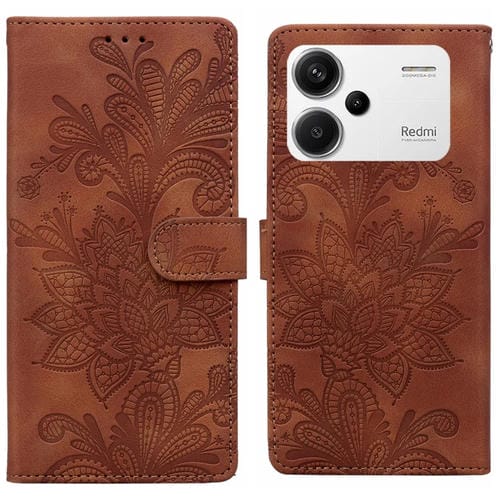 Funda de Teléfono con Hebilla Magnética de Pu con Encaje Floral En Relieve y Correa para la Muñeca para Redmi Note 13 Pro+ (Marrón)