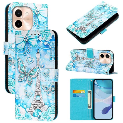 Funda de Teléfono de Cuero con Patrón de Dibujo de Colores y Tejido Liso para Vivo Y28 4G (Mariposa En Forma de Torre)
