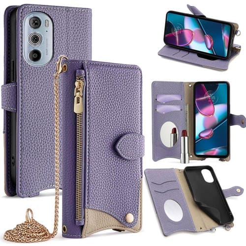 Funda de Cuero de Lichi con Cola de Pez y Cadena Cruzada para Motorola Edge+ (2022) / Edge 30 Pro (Morado)