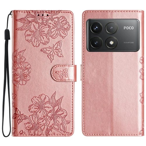 Funda de Teléfono de Pu con Relieve de Piel de Mariposa y Flor de Cerezo para Xiaomi Poco F6 Pro (Oro Rosa)