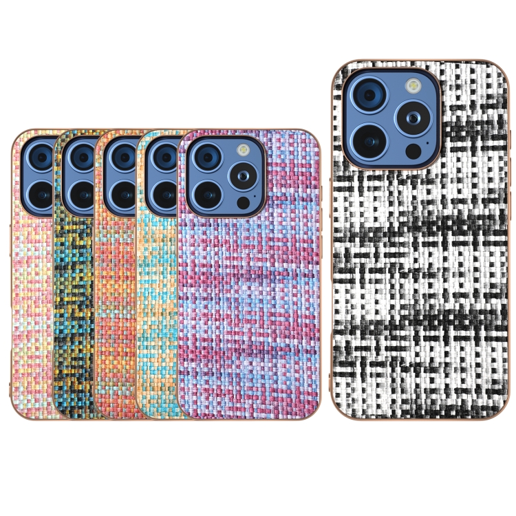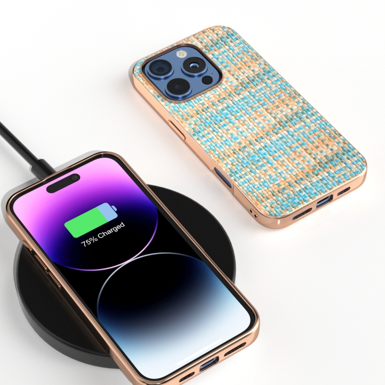Funda de teléfono PU con textura de celosía y marco galvanizado para iPhone 16 Pro (Azul)
