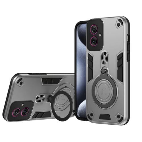 Funda Híbrida TPU y PC con Soporte Giratorio 360° y Anillo Metal para Motorola Moto G55 (Gris Plateado)