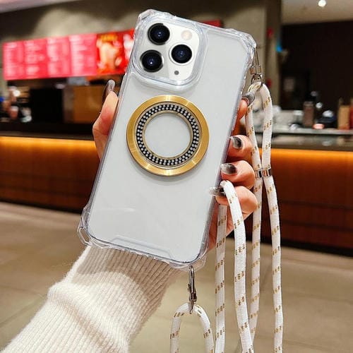 Funda de Teléfono TPU Transparente con Cuatro Esquinas y Cordón para iPhone 11 Pro Max Traveler Crossbody (Blanca)