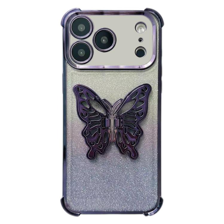 Funda de TPU con diseño de mariposa 3D con purpurina galvanizada y cuatro esquinas a prueba de golpes para iPhone 17 Pro Max (morado degradado)