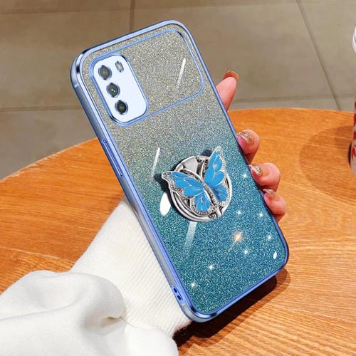Funda de TPU con Soporte para Mariposa con Purpurina Degradada para Xiaomi Poco M3 (Azul Sierra)