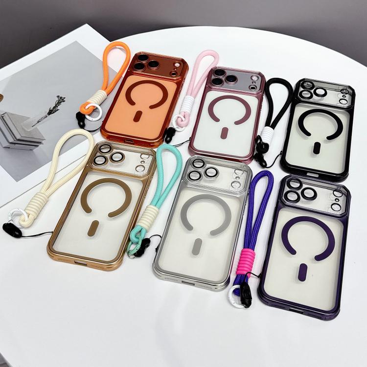 Funda de TPU electrochapada mate MagSafe con ventana grande y correa de mano para iPhone 17 Pro Max (plateada)