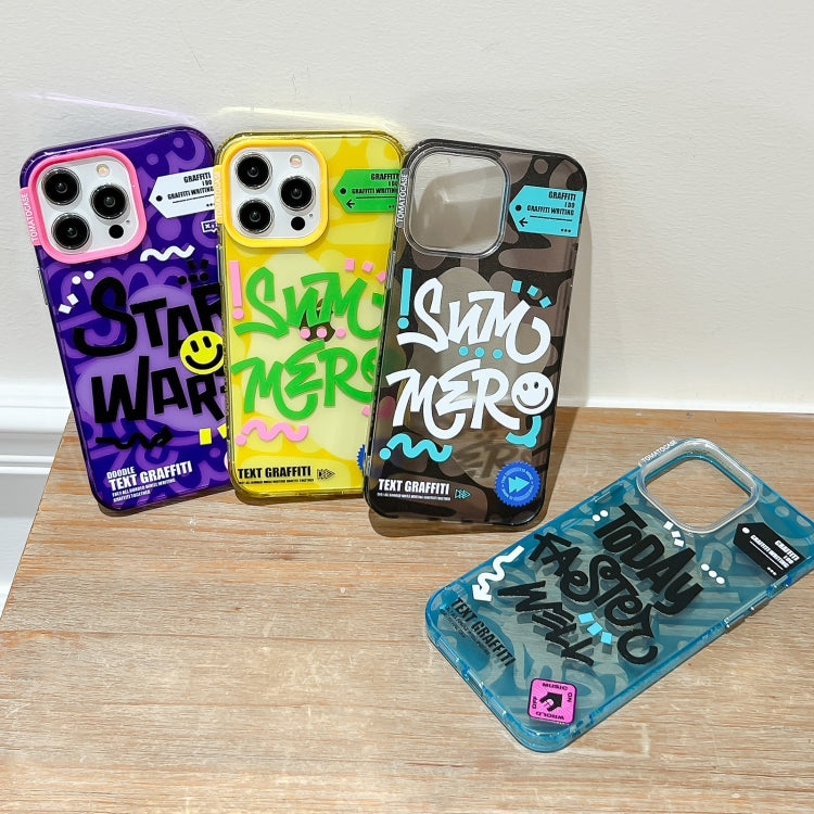 Funda híbrida TPU y PC con texto en grafiti y tomate para iPhone 14 (Morado)