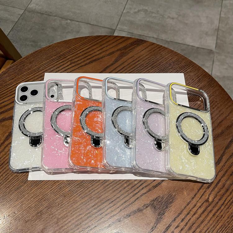 Funda para iPhone 17 con carcasa dorada y colorida, diseño estampado, TPU+IMD, con soporte magnético brillante (naranja).