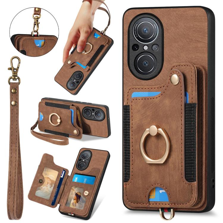 Funda para Teléfono Huawei Nova 9 Se con Billetera MultiTarjeta, Anillo y Diseño Retro de Piel Sintética (Marrón)