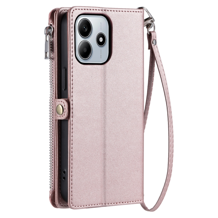 Funda para Teléfono con Cremallera y Ranura para Varias Tarjetas con Costuras de Cuero para Xiaomi Redmi Note 14 5G (Oro Rosa)