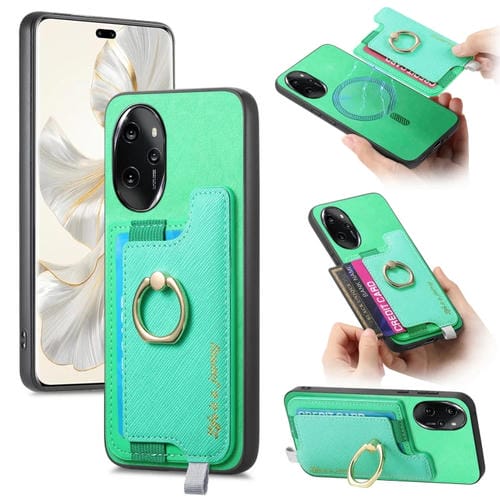 Funda para Teléfono Honor 100 Pro con Tarjetero y Anillo de Cuero Retro Magsafe (Verde)