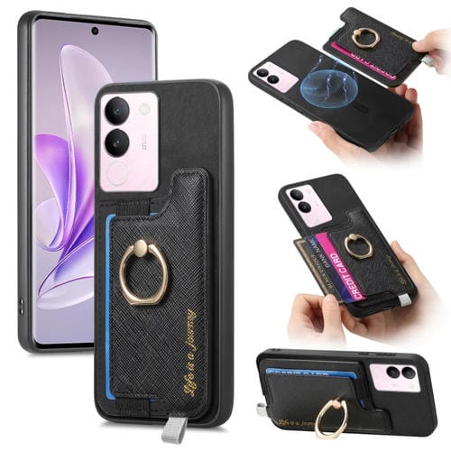Funda para Teléfono con TaRJetero y Anillo de Cuero con Diseño Retro Magsafe Cross para Vivo S17 / S17 Pro / V29 Pro 5G (Negro)