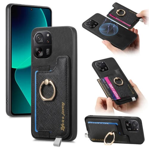 Funda para Teléfono con TaRJetero y Anillo de Cuero con Diseño Retro Magsafe Cross para Xiaomi 13T/13T Pro (Negro)