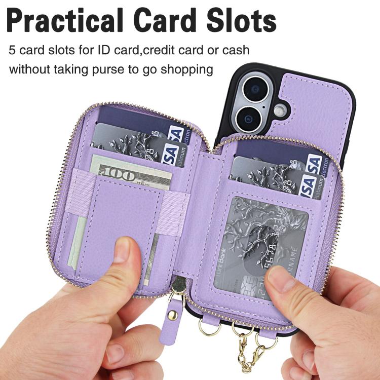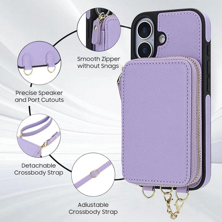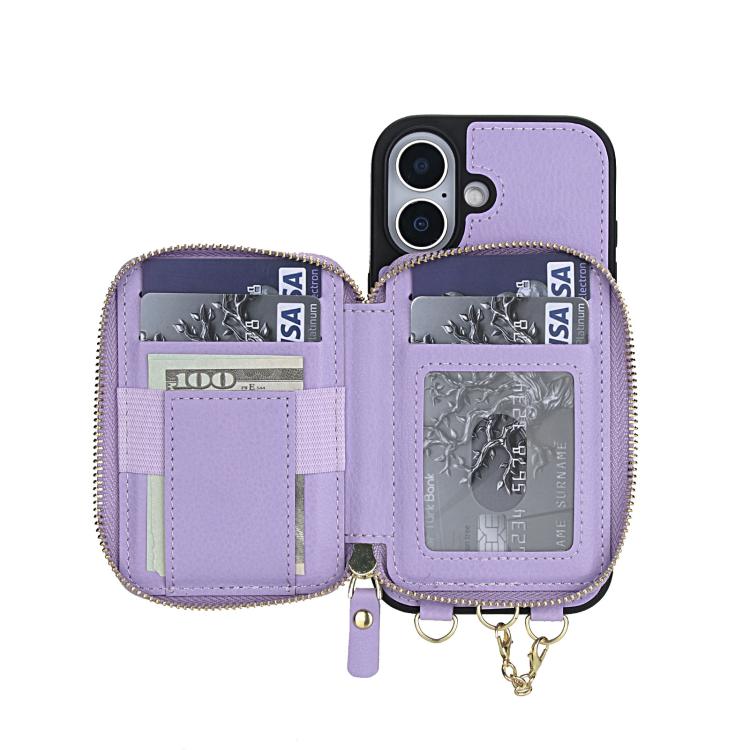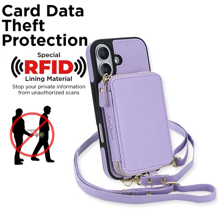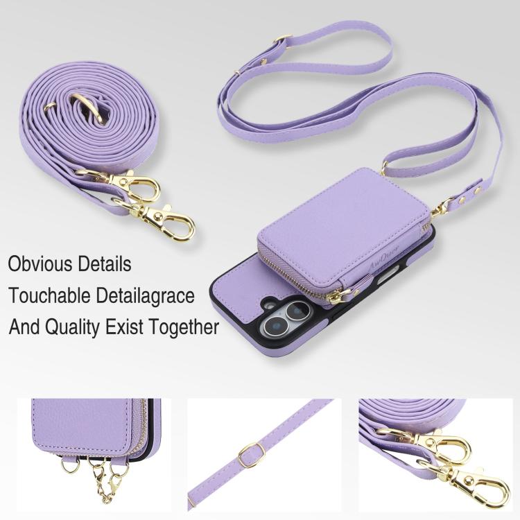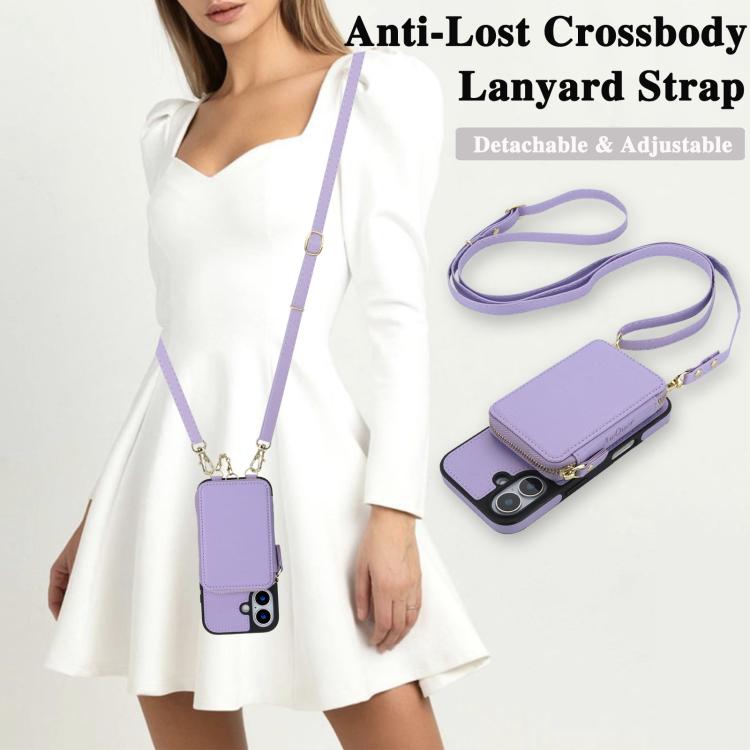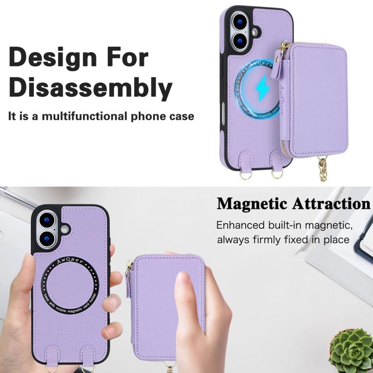 Funda tipo cartera bandolera con cremallera 2 en 1 AwQuer para iPhone 17 con parte trasera de cuero (morado claro)