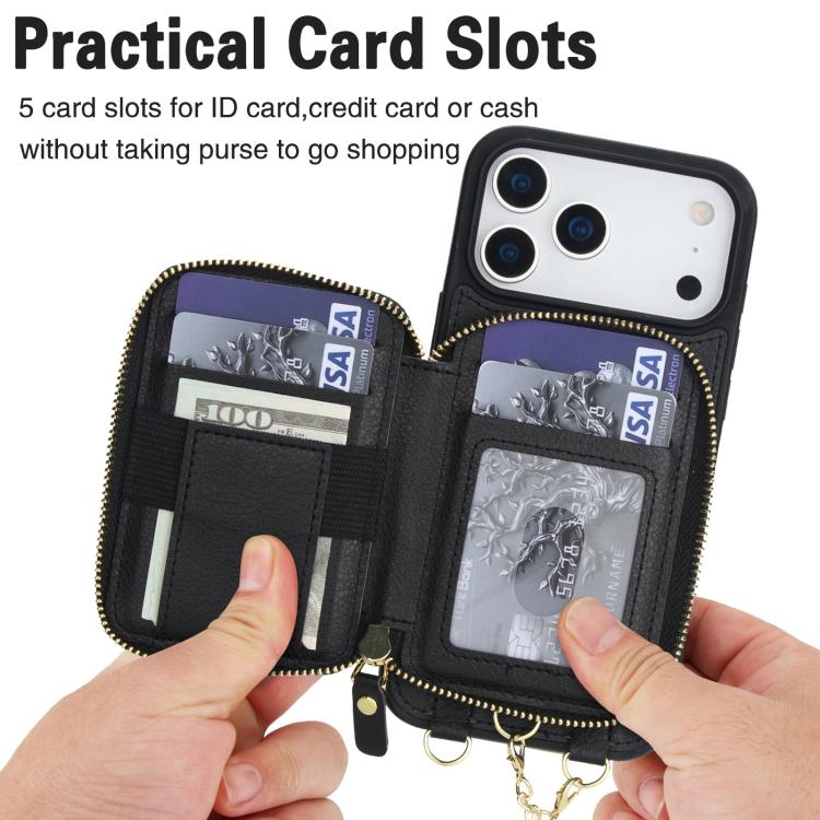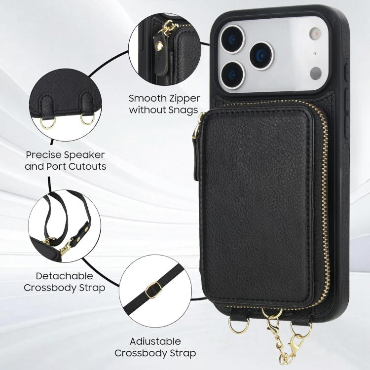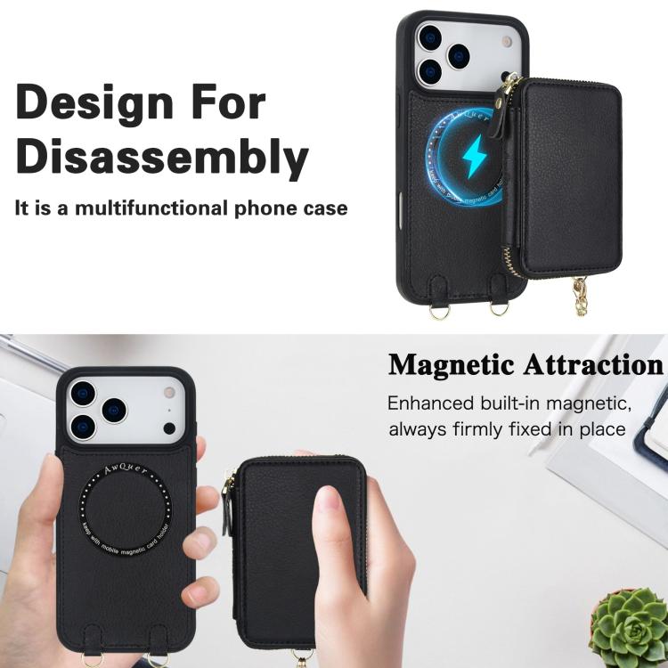Funda tipo cartera bandolera con cremallera AwQuer 2 en 1 para iPhone 17 Pro Max con parte trasera de cuero (negra)